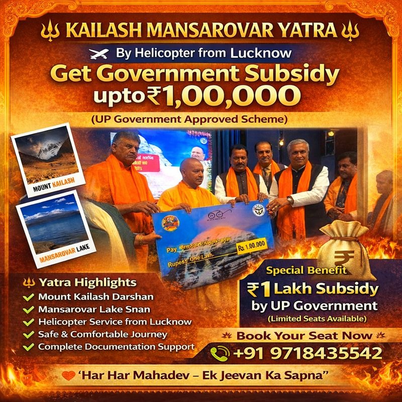 Embark on the sacred Kailash Mansarovar Yatra with comfort, safety, and official support. Travel by helicopter from Lucknow under a UP Government–approved scheme and receive a government subsidy of up to ₹1,00,000. Experience the spiritual bliss of Mount Kailash Darshan and holy Mansarovar Lake Snan, with complete documentation assistance and a well-managed itinerary. Limited seats available—book your place on this once-in-a-lifetime pilgrimage today.